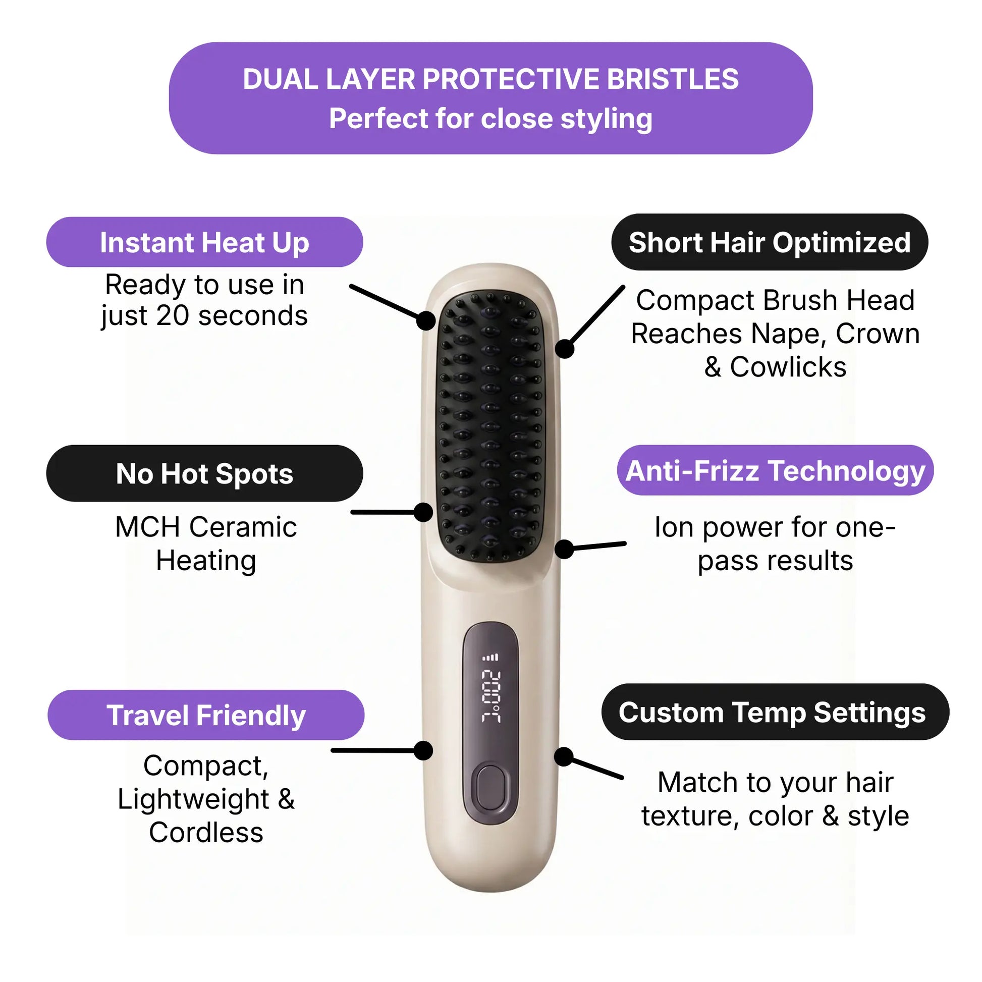 Our heated comb creates instant, lasting volume from the crown to the nape—all with one hand.